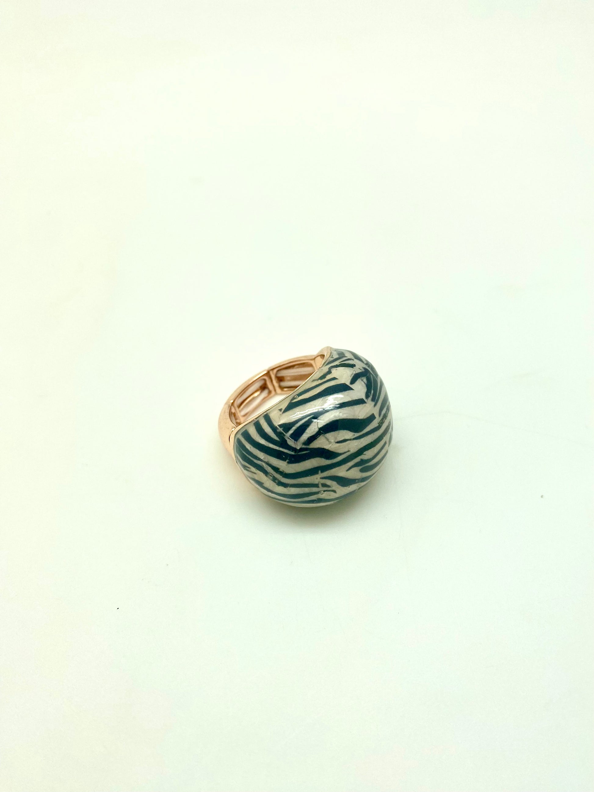 Anillo montado en aleación de metales y bañado con esmalte de estampado cebra en la parte superior. El anillo es talla única ya que es elástico para que se adapte a la medida del dedo