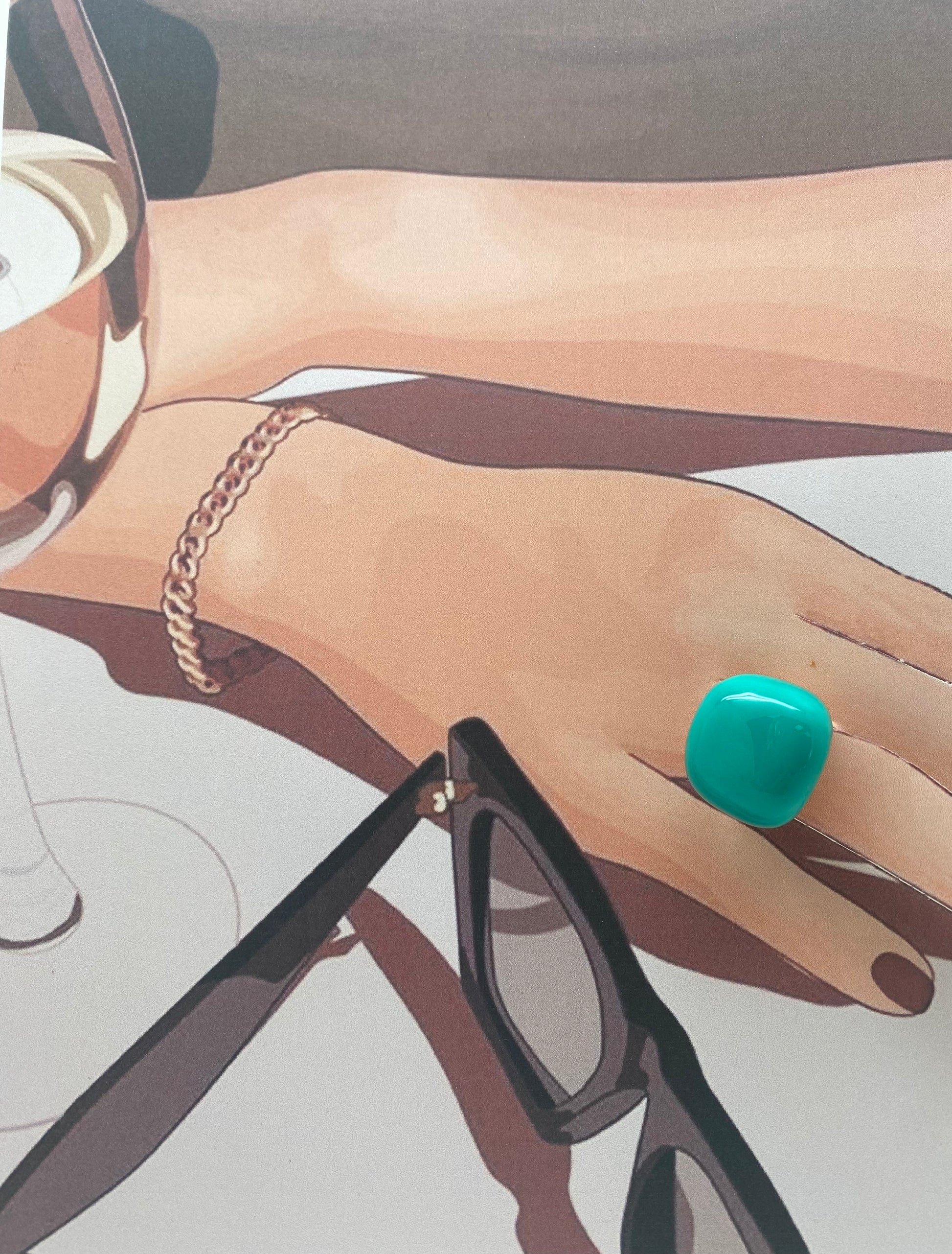 Anillo montado en aleación de metales y bañado con esmalte de color verde en la parte superior. El anillo es talla úniva ya que es elástico para que se adapte a la medida del dedo