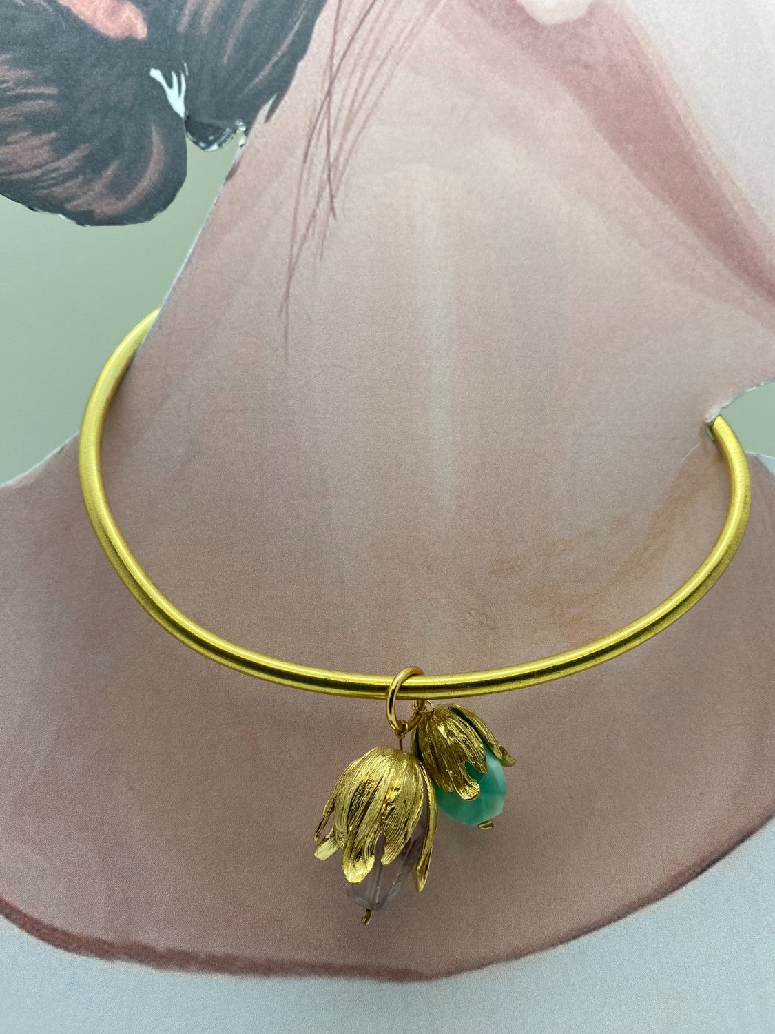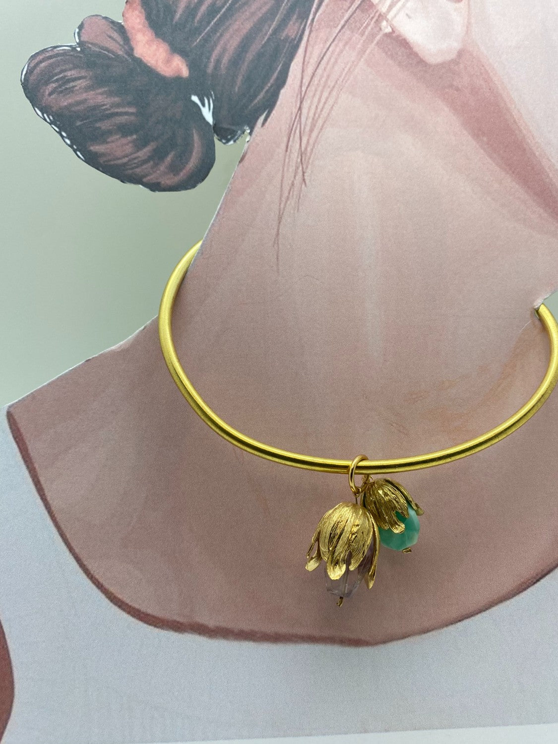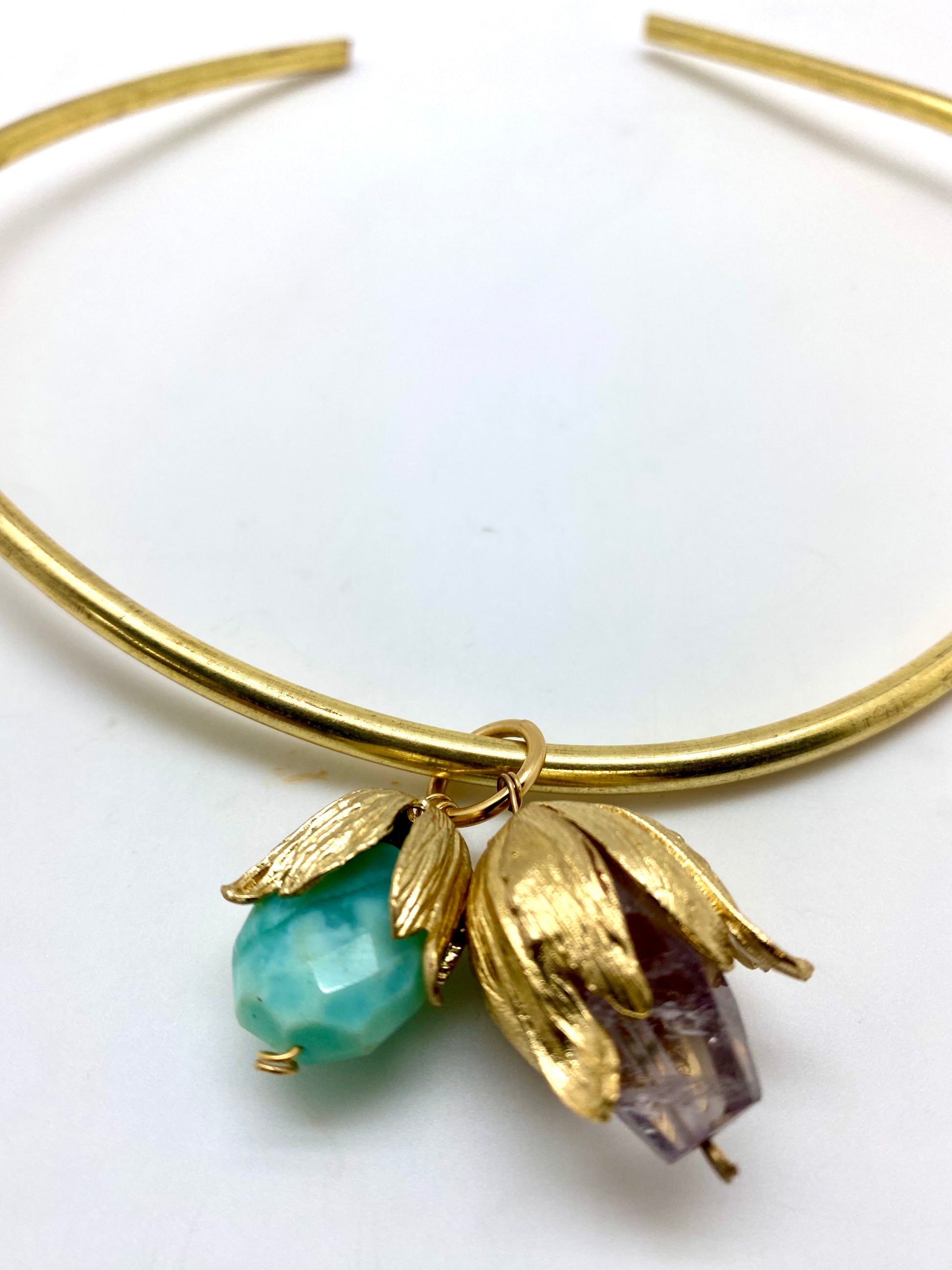 Aro de 37cm con colgante de flores con piedras naturales una amatista y una turquesa, todo latón bañado en oro.Acabado a mano.Materiales de primera calidad. Medidas Aro 37cm Flor grande 3cmx2cm Flor pequeña 2cmx105cm.