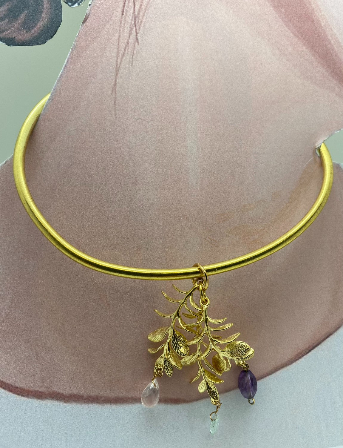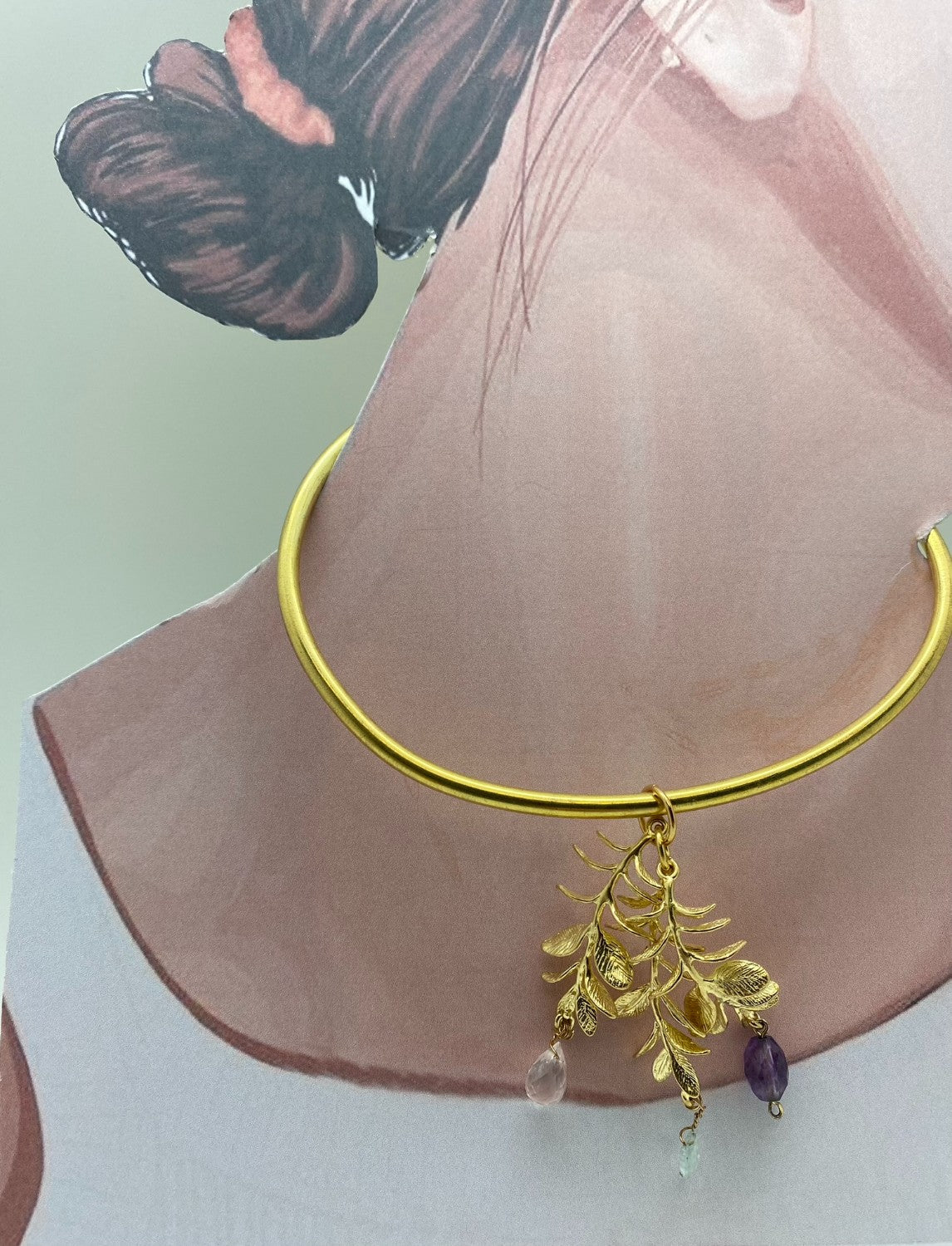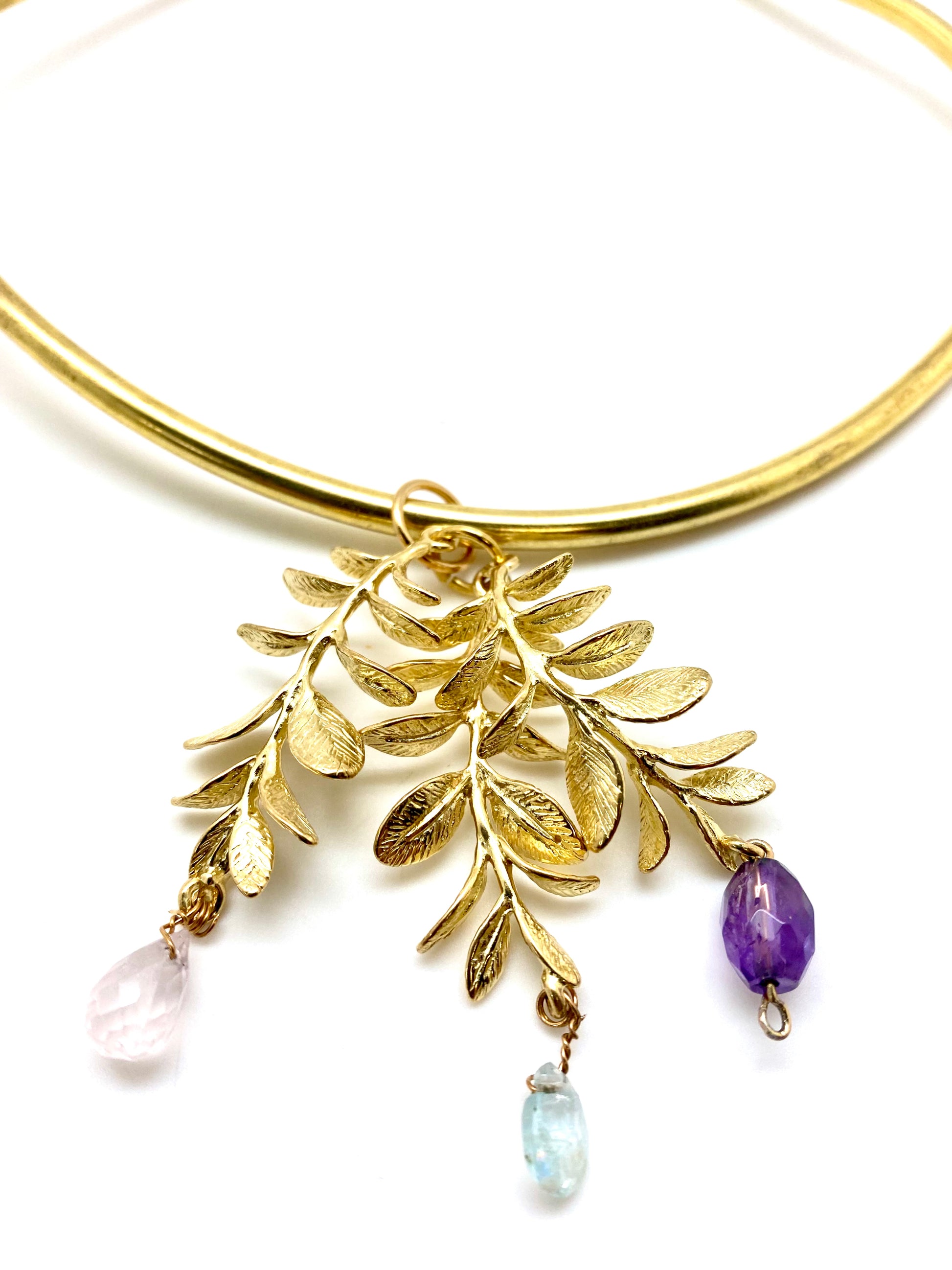 Aro de 37cm con colgante de tres hojas y piedras naturales amatista, aguamarina, cuarzo rosa de latón bañado en oro. Acabado a mano. Materiales de primera calidad. Medidas Aro 37cm Colgante 5,5cmx6cm