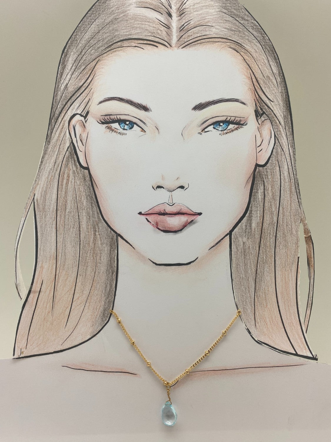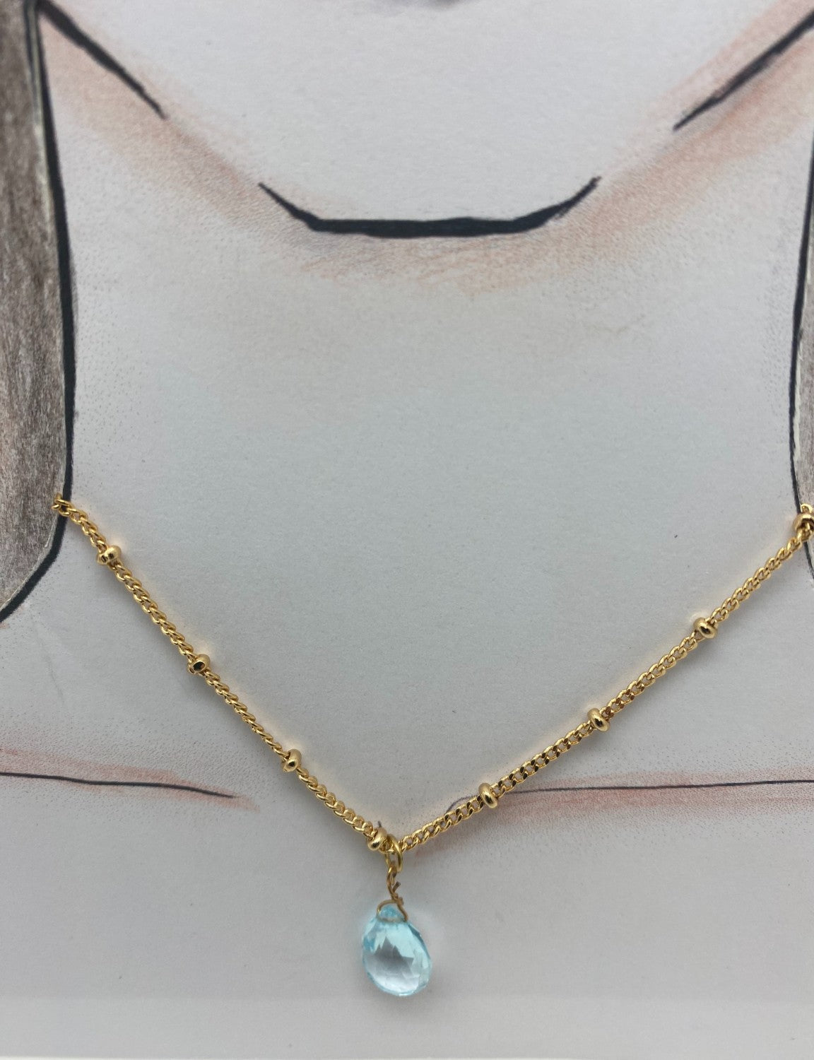 Cadena fina con bolitas de aleación de latón con baño y colgante de lágrima de piedra natural aguamarina.Acabado a mano. Materiales de primera calidad. Medidas lágrima 1cm Largo total 40cm + 4cm de alrgo