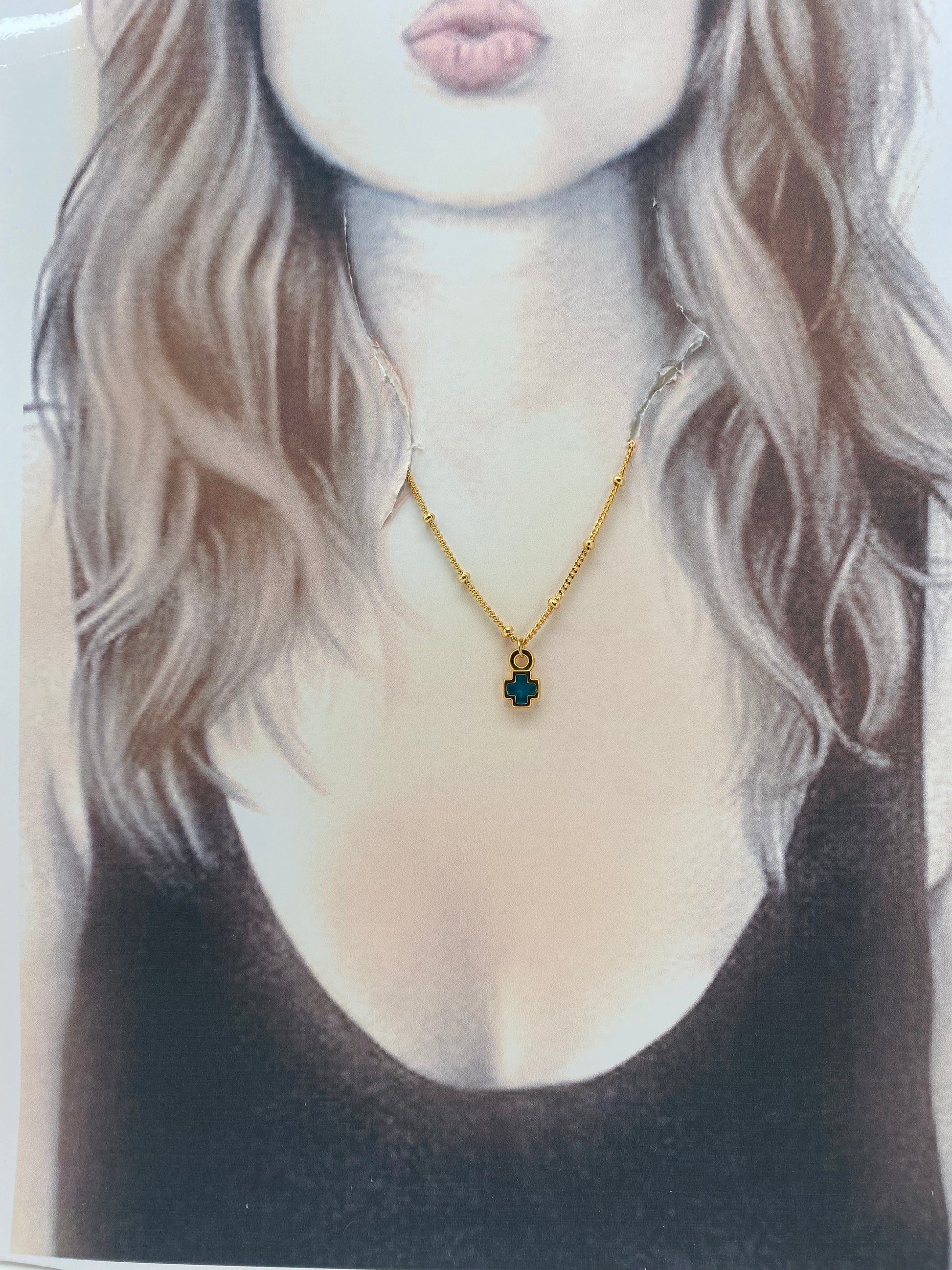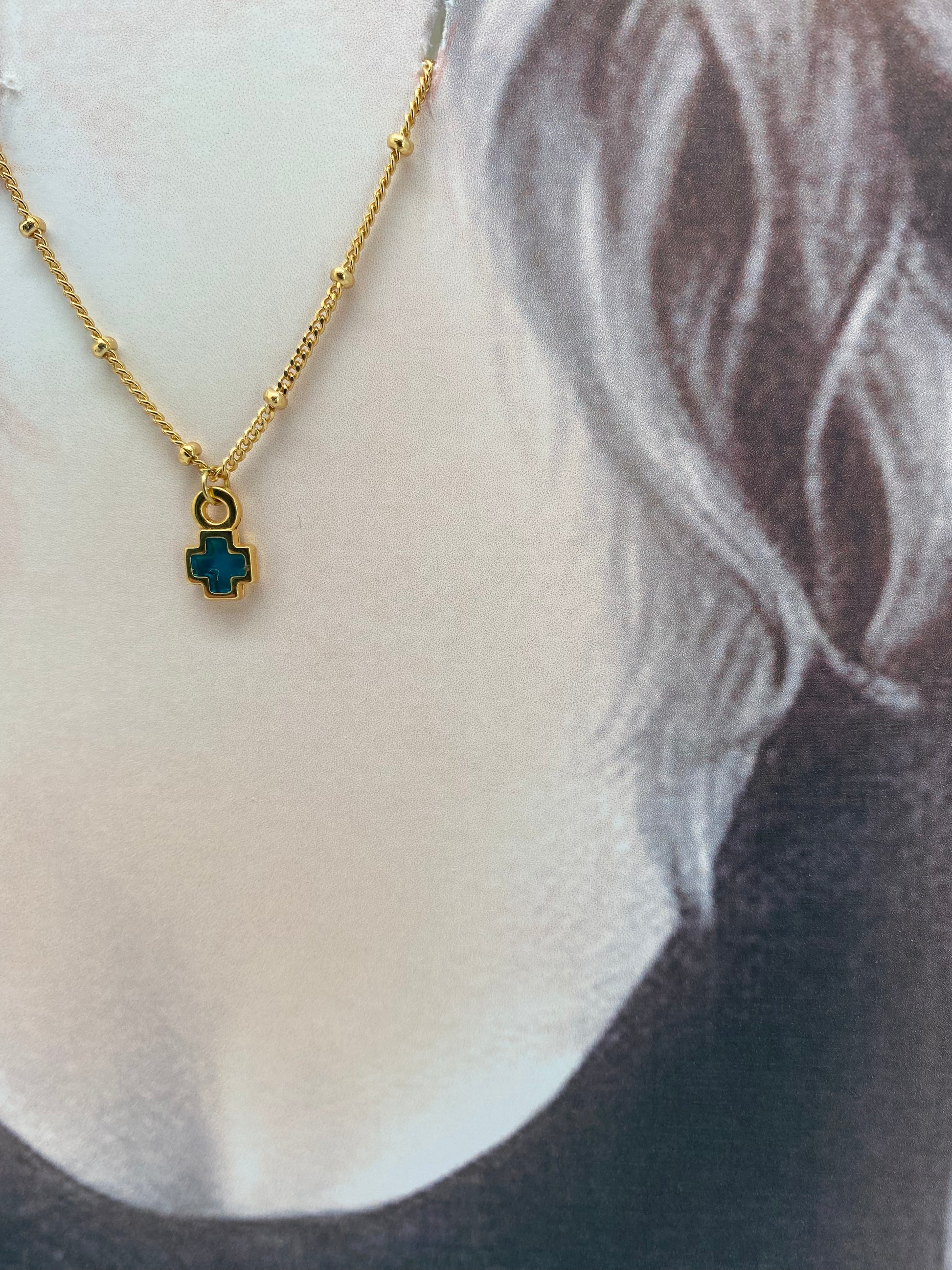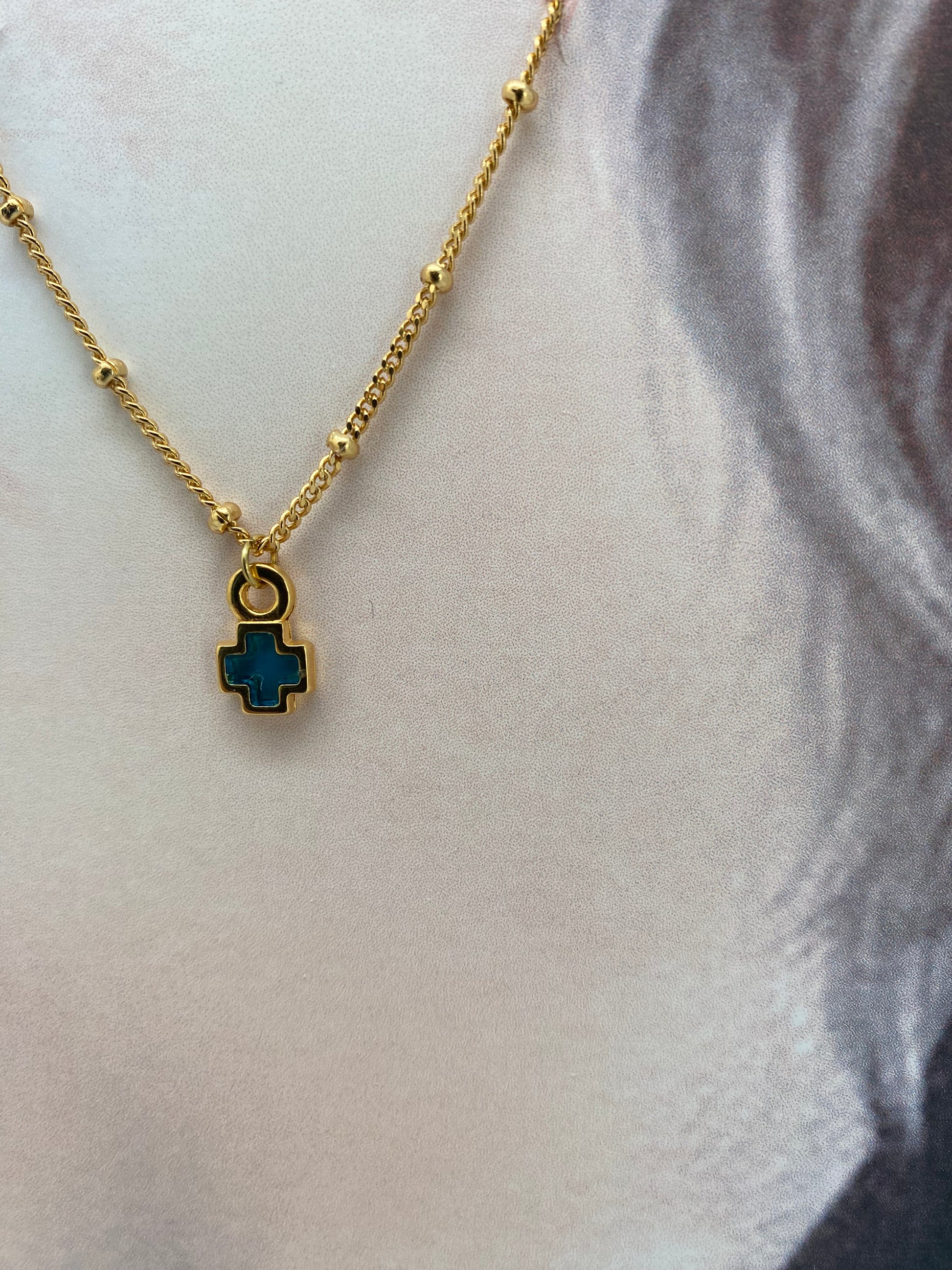 Cadena fina de aleación con baño y colgante en forma de cruz con esmalte azul. Acabado a mano. Materiales de primera calidad. Medidas colgante 0,7cm. Largo total 42cm+4cm de alargo