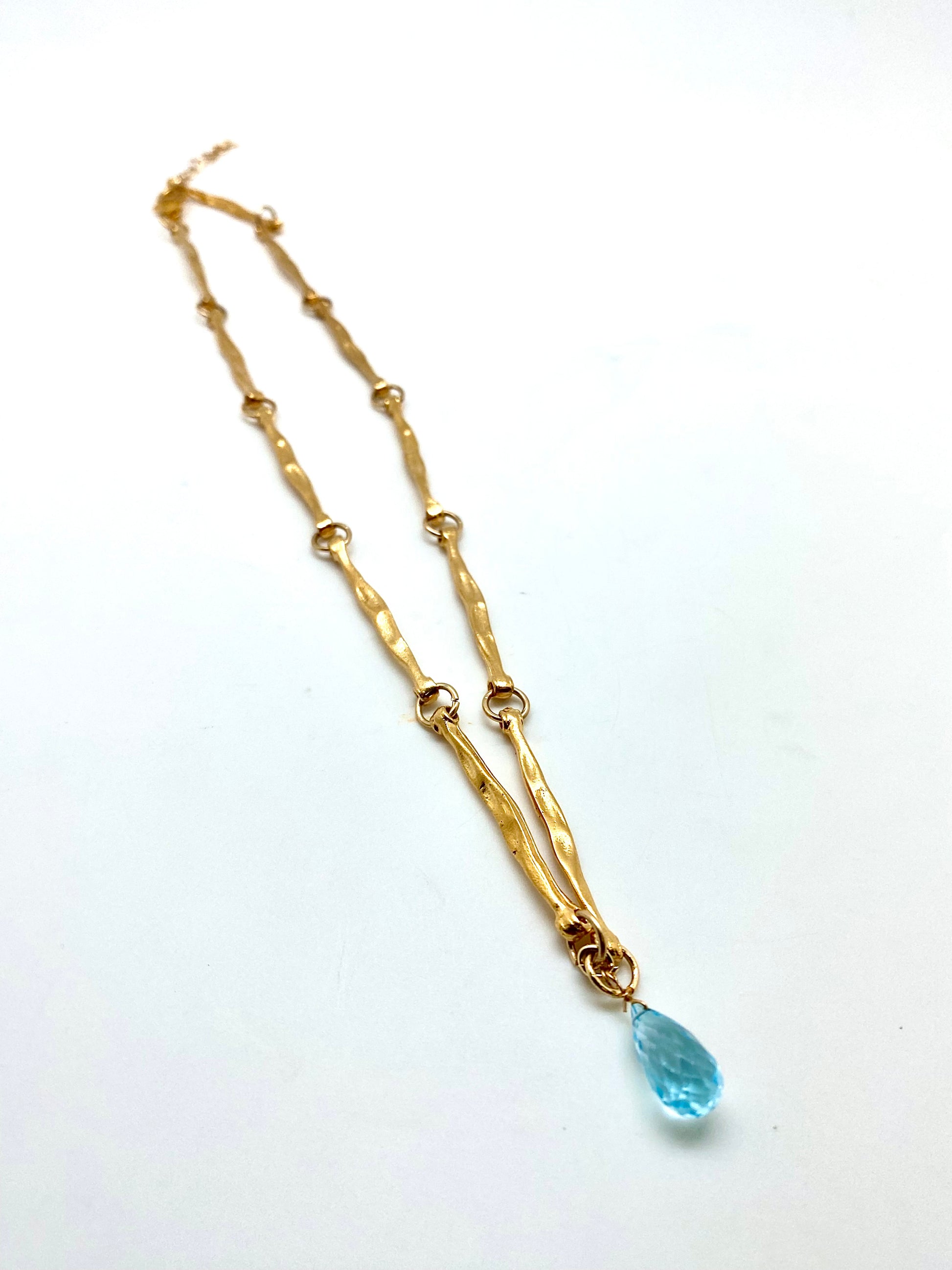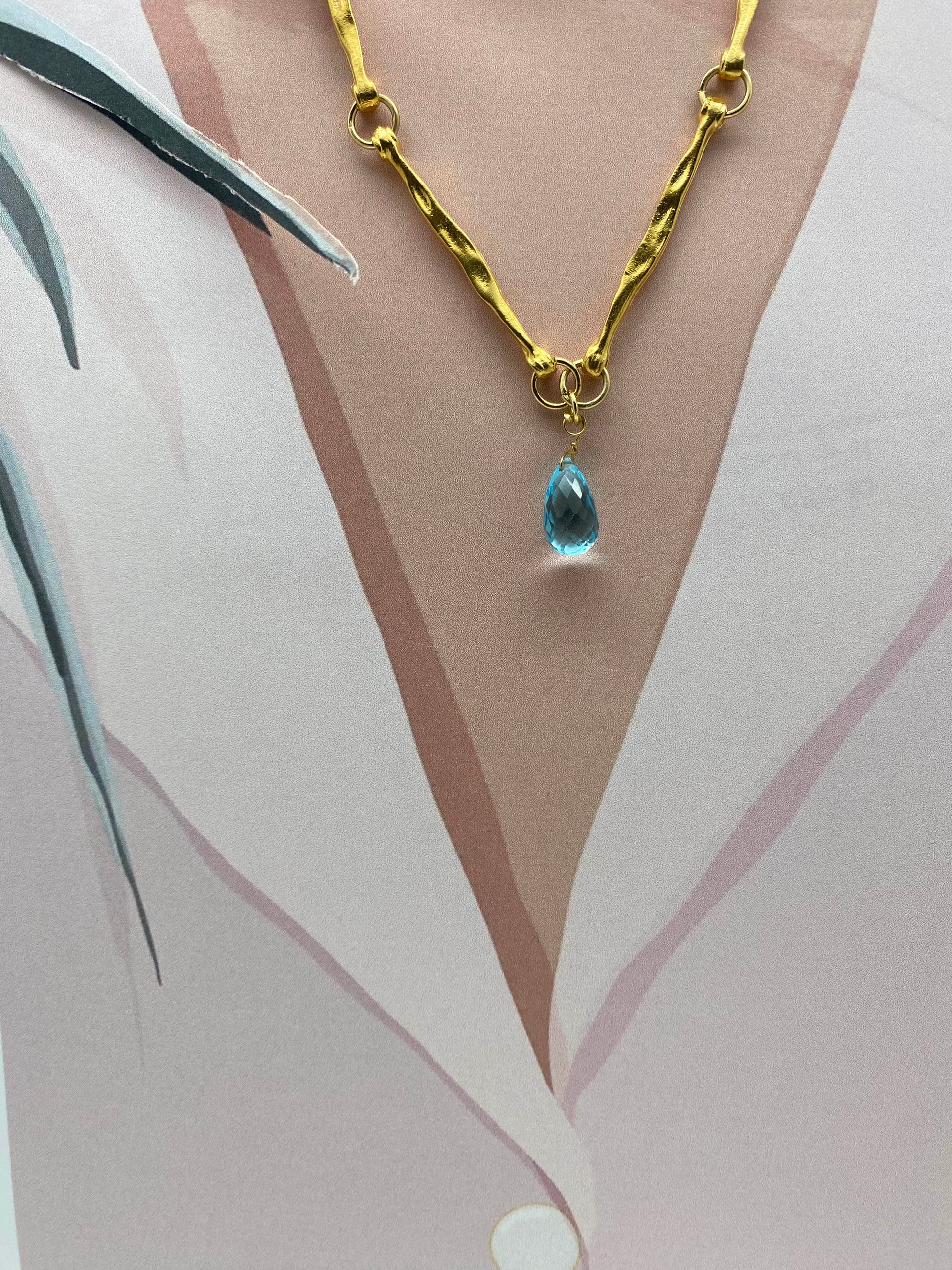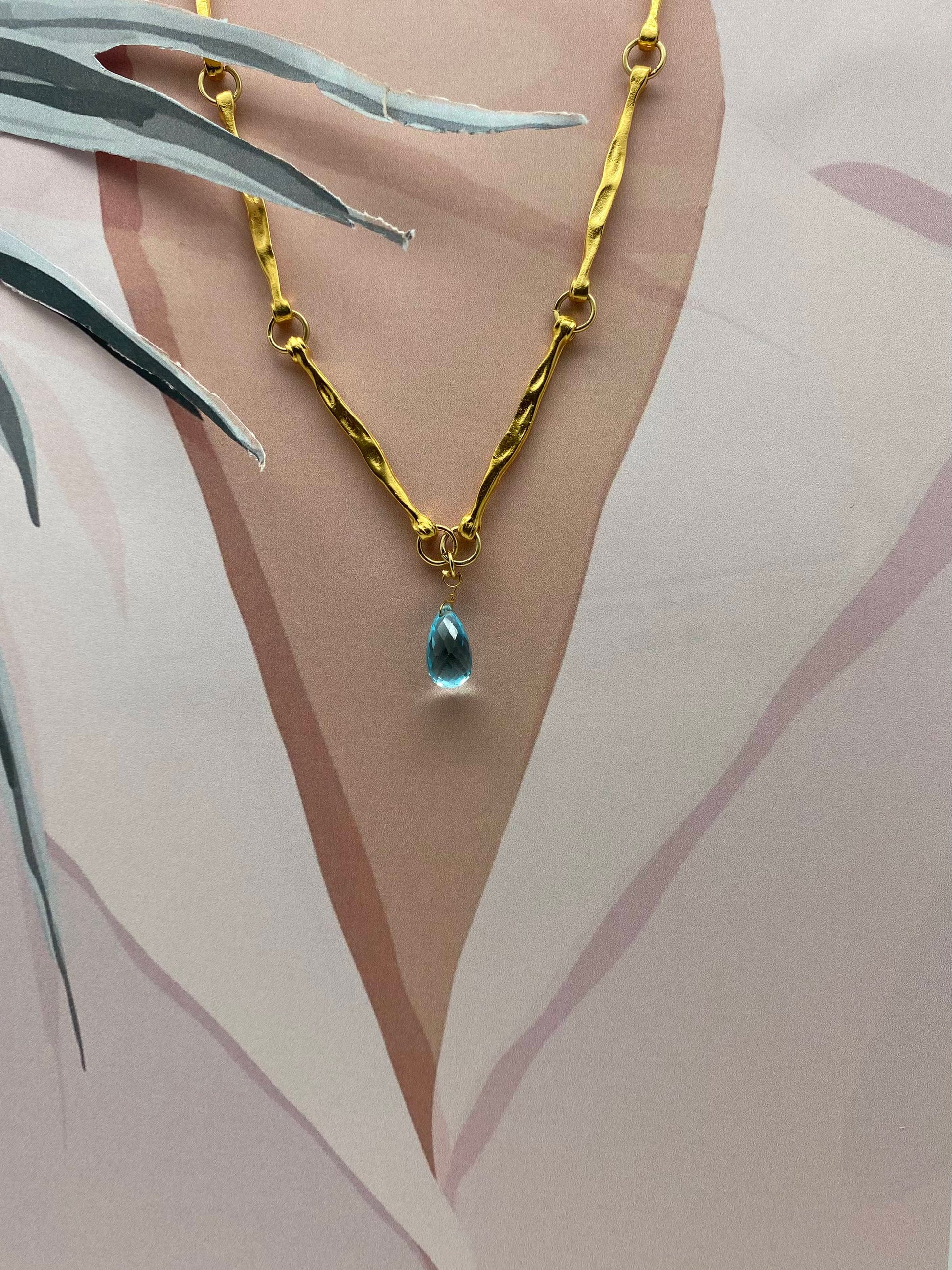 Collar de eslabones con forma alargada y terminados martelé de latón bañados en oro con piedra natural de aguamarina (largo1,7cmxancho 1,5cm). Acabado a mano.Materiales de primera calidad. Medidas Largo 49cm +alargo de 4cm