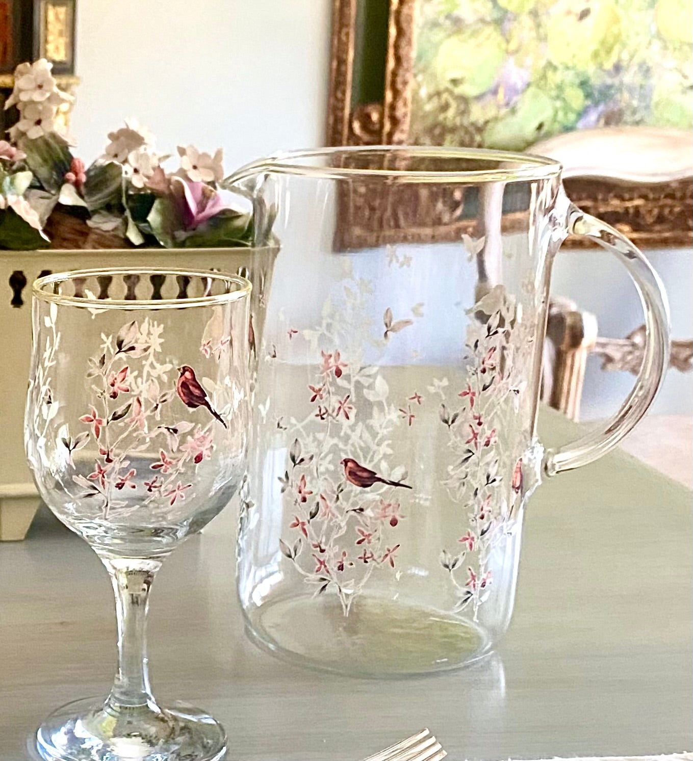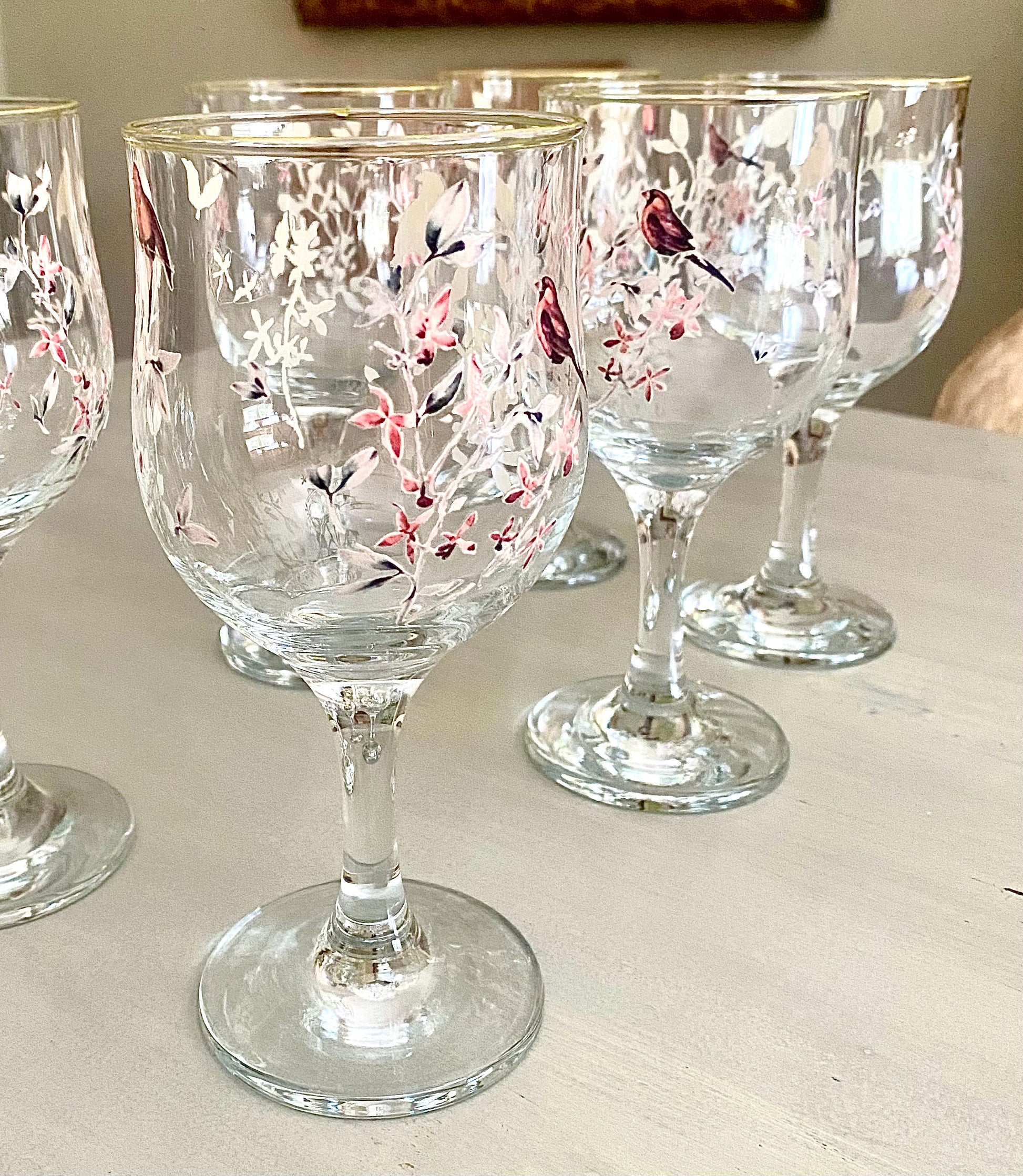 Copa de cristal decoradas con dibujos de flores que se transfieren al cristal mediante un proceso especial de impresión resistente al agua.