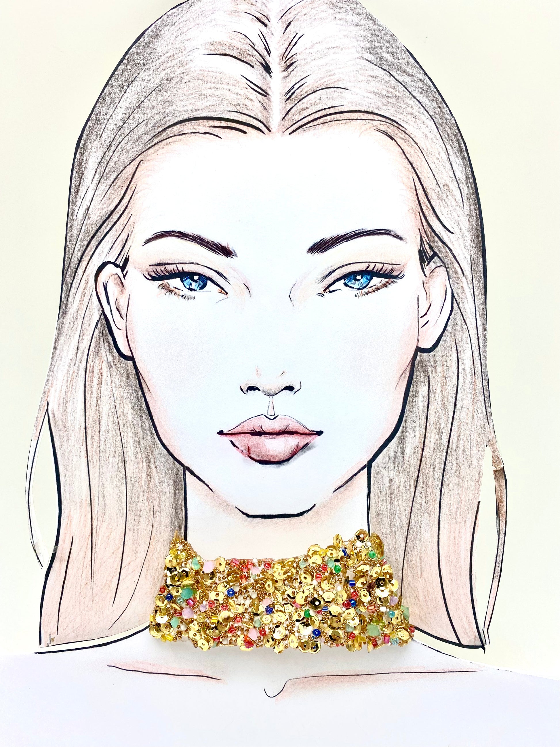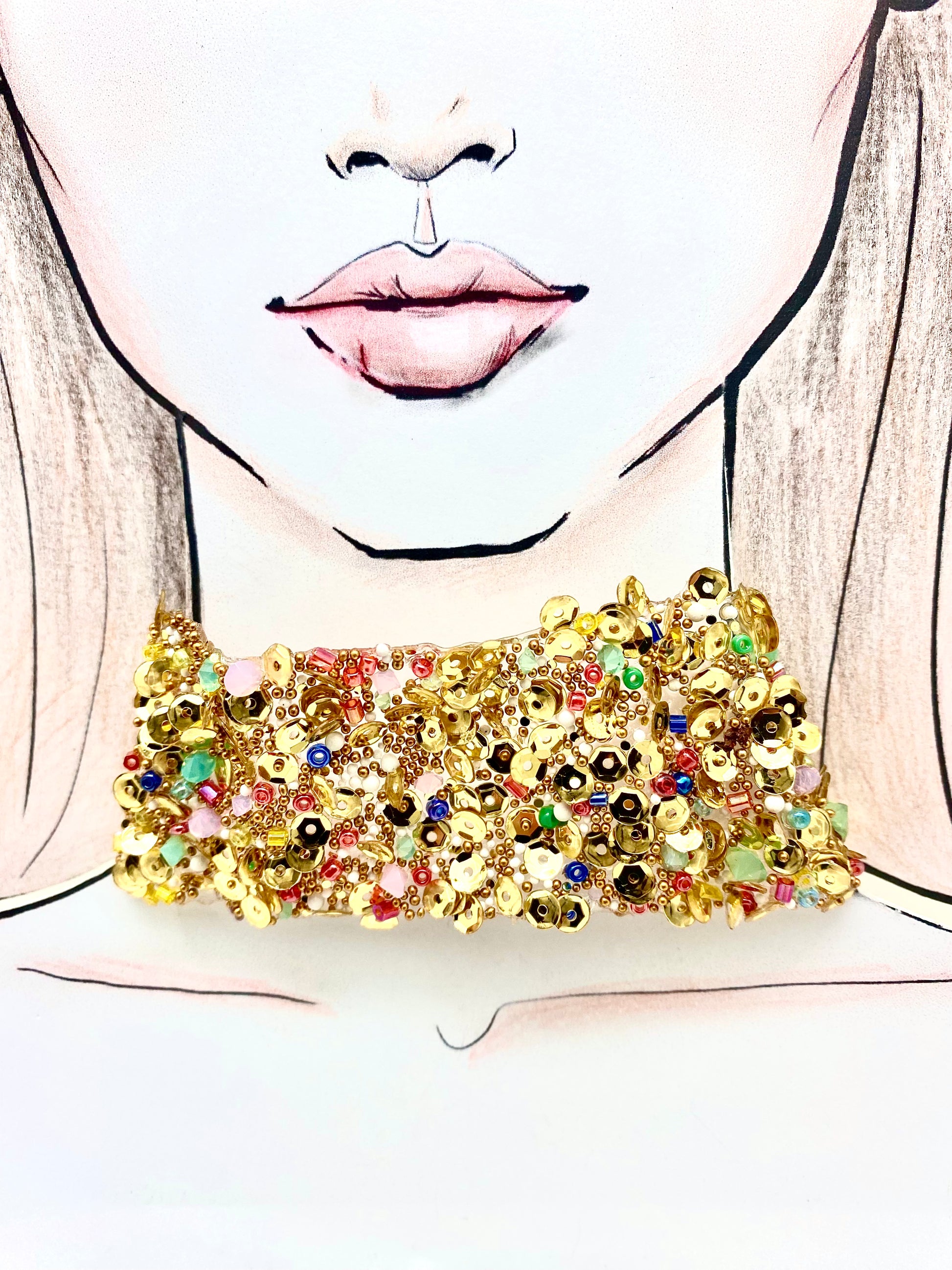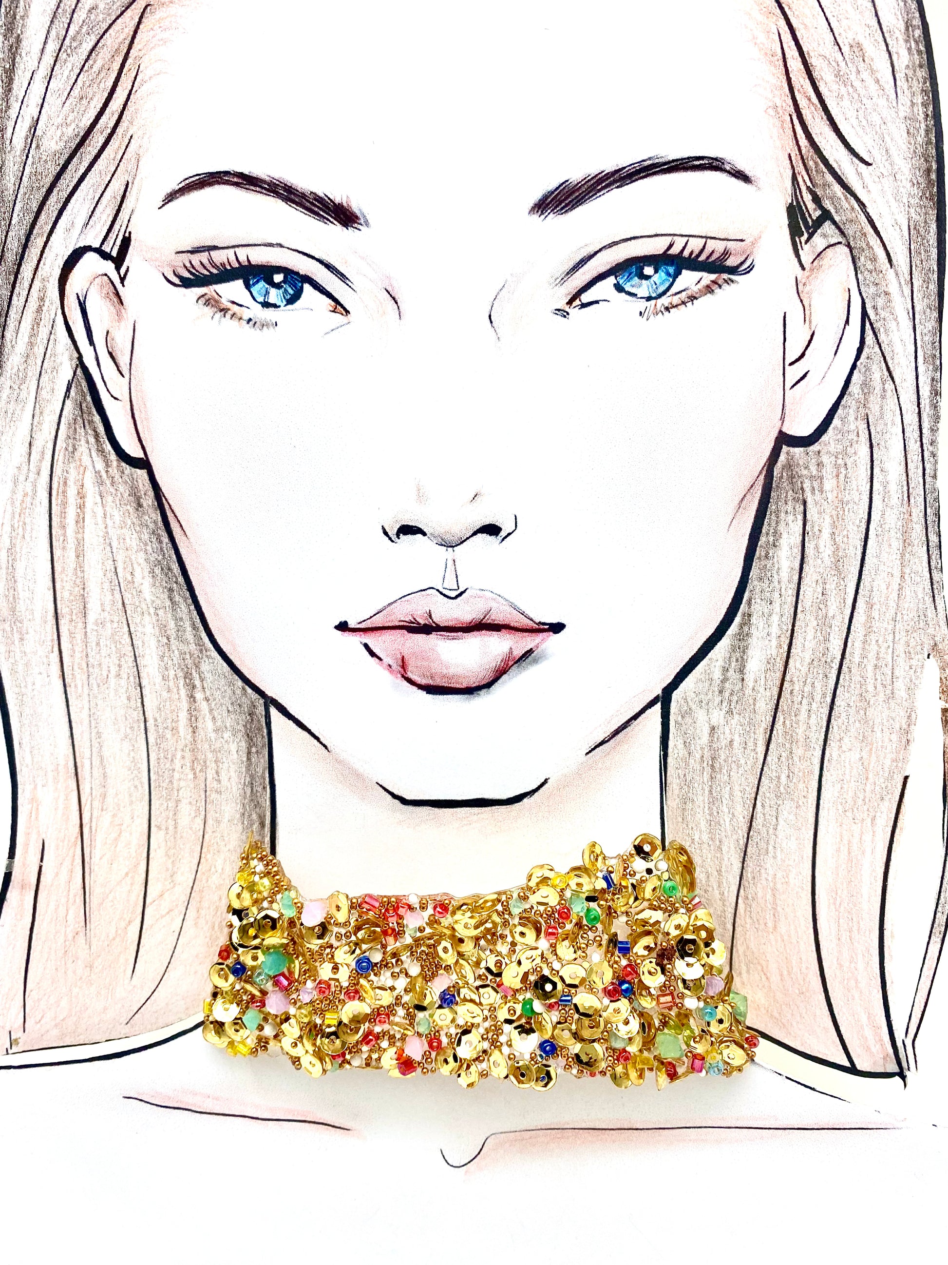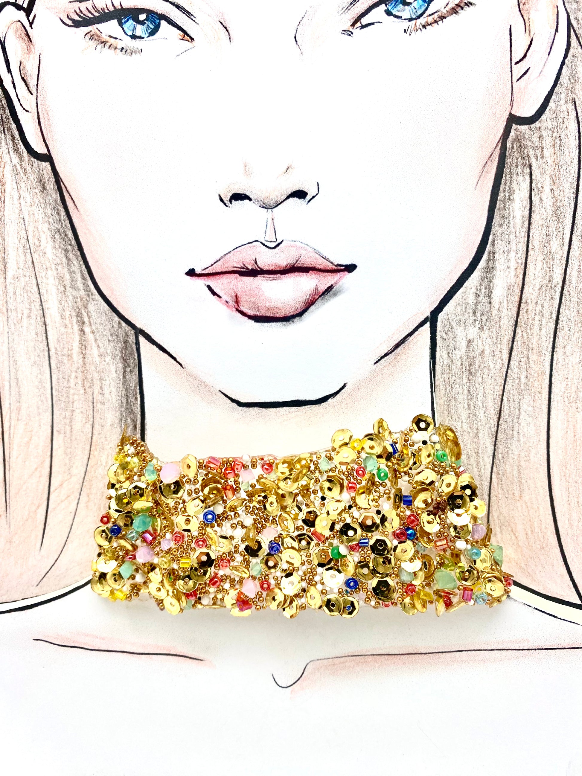 Gargantilla con adornos dorados y piedras de variados colores montada en cinta con cierre de mosquetón.Materiales de primera calidad. Medidas Ancho 3.5cm Largo 30cm + 10cm de alargo