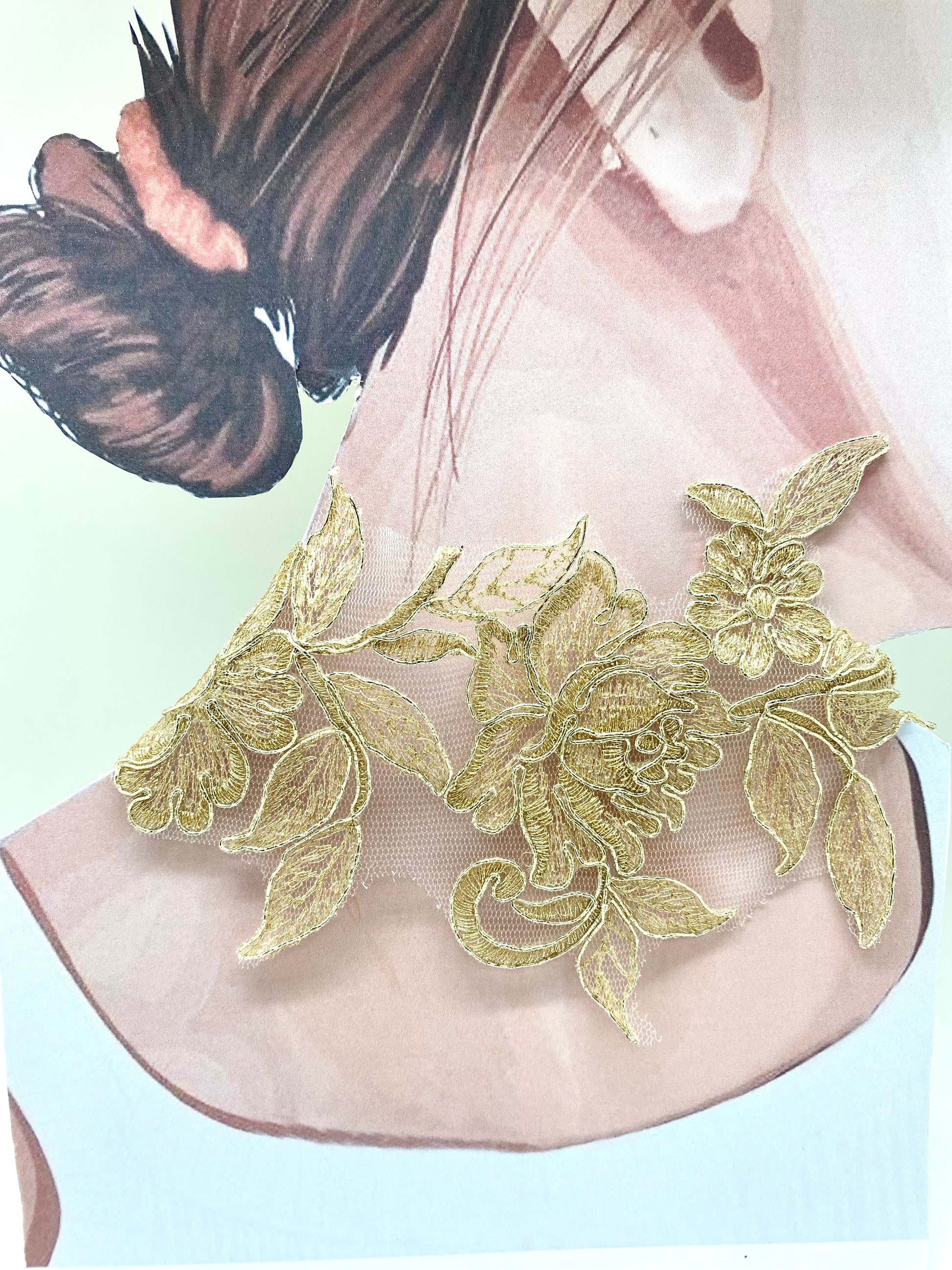 Gargantilla confeccionada con encaje de hilo dorado envejecido, cierre con mosquetón y alargo en latón dorado