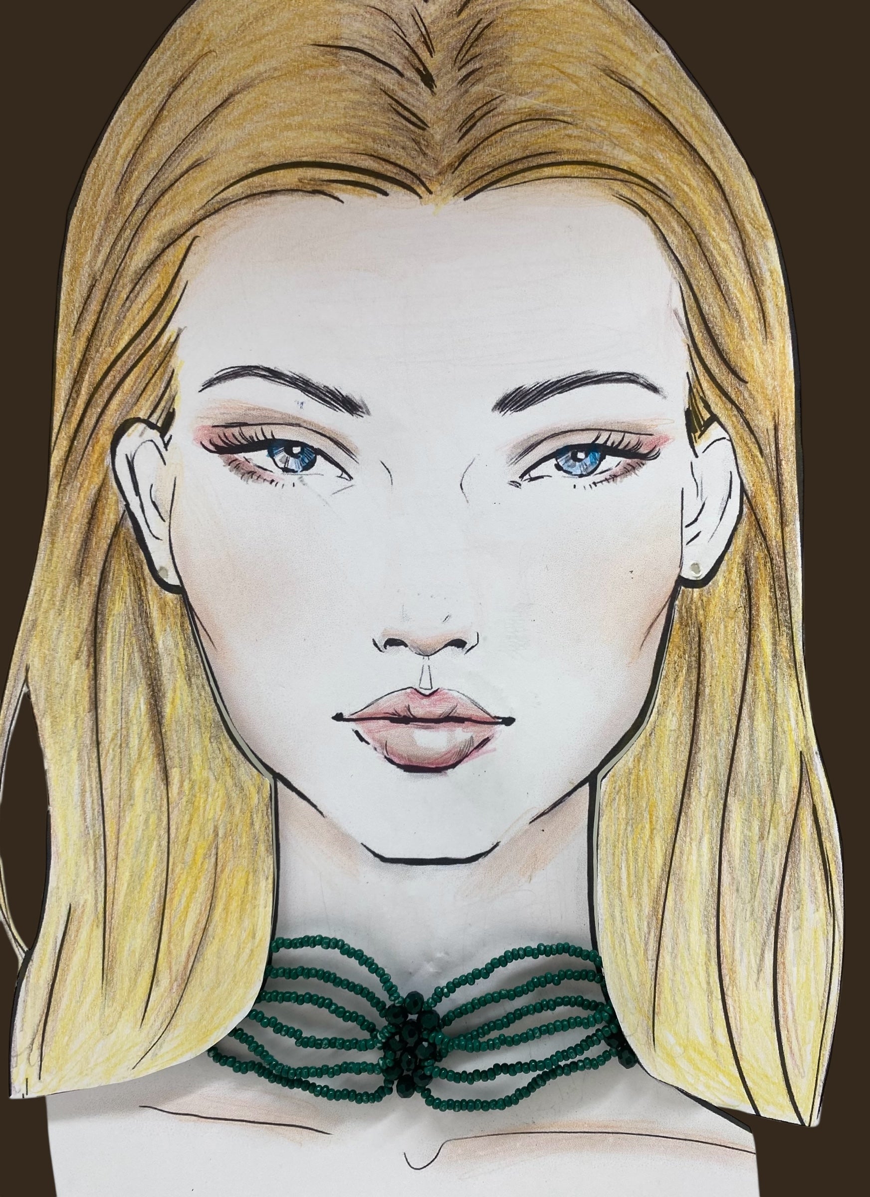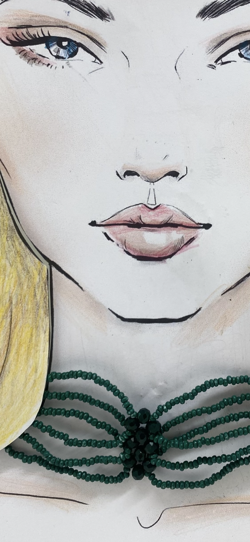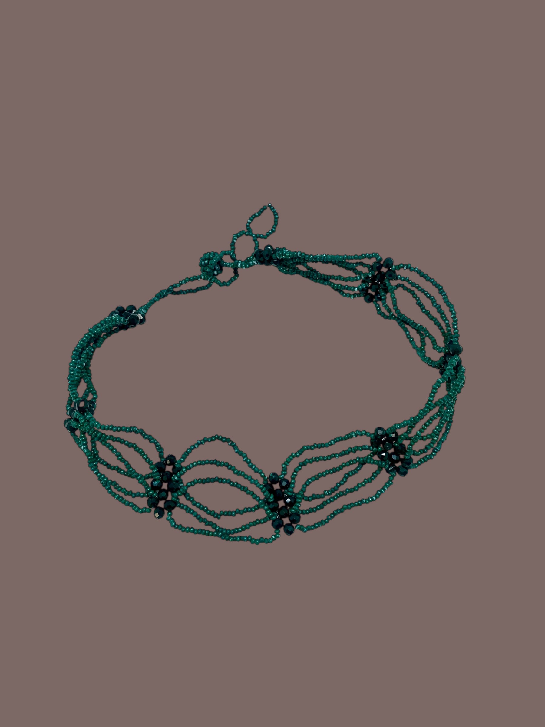 Gargantilla elaborada con cuentas de cristal color verde formando rosetones. Hecha a mano