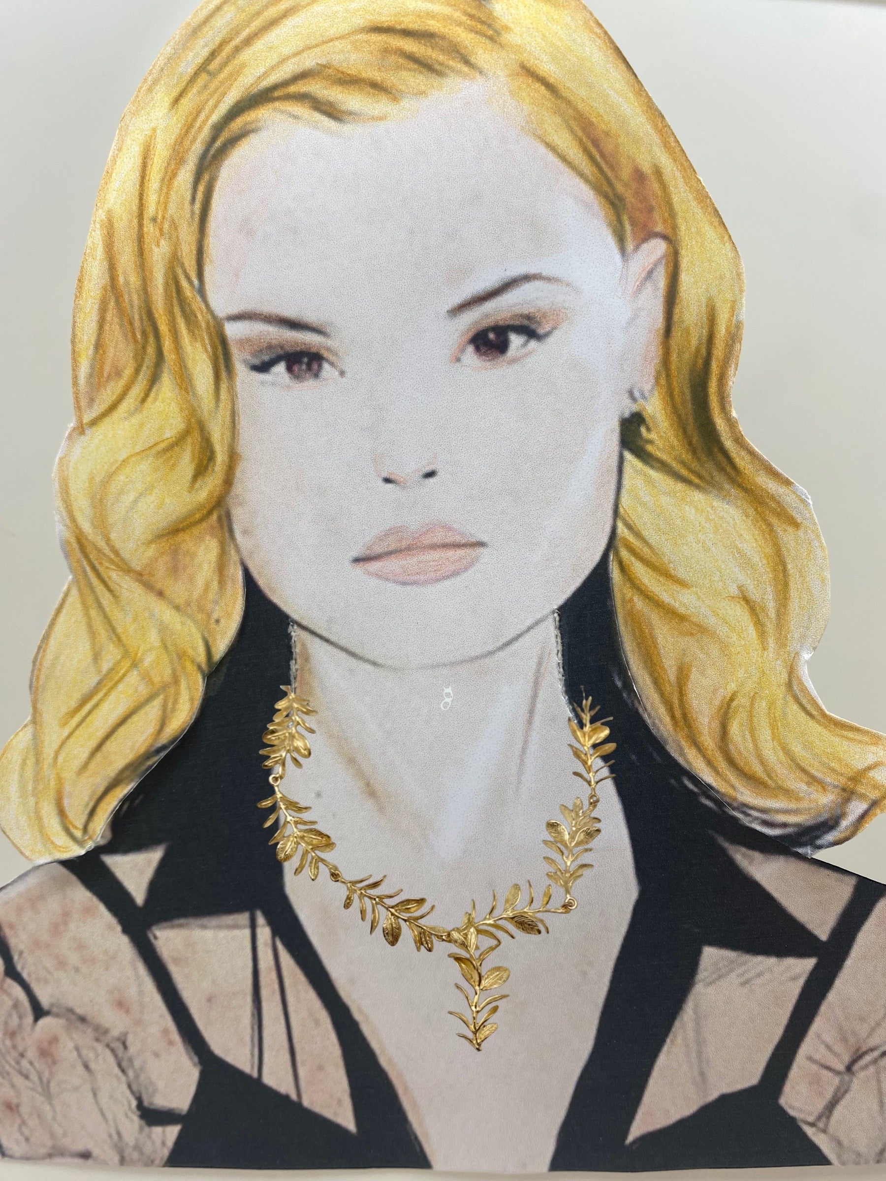Gargantilla realizada en latón con baño de oro con forma de ramas de hojas de laurel. Cordón de algodón y seda color marrón con cierre de mosquetón y alargo de cadena para ajustar a la medida deseada. Materiales de primera calidad
