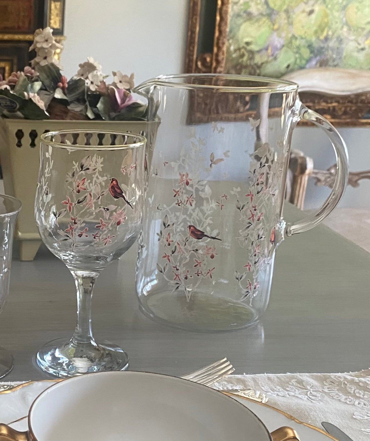 Jarra de la colección Begur decorada con delicados dibujos florales transferidos a papel y aplicados con una técnica especial resistente al agua que asegura su durabilidad y brillo incluso tras múltiples usos y lavados.